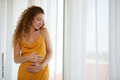 pregnant woman smiling and relaxing in the bedroom