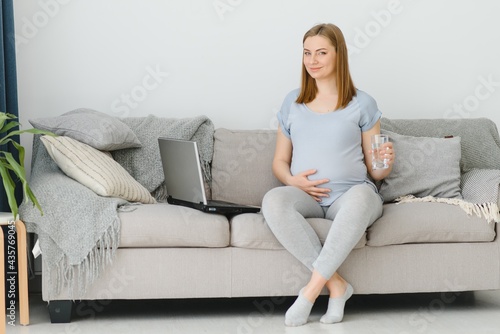Pregnant woman with glass of water sitting on sofa. Young expectant blonde rest at home, copy space. Pregnancy, healthcare, thirst concept