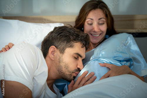 Pregnant woman with husband in bedroom with the atmosphere of having fun talking