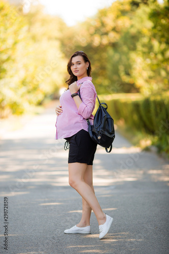pregnant young girl on a walk in the fresh air in summer,pregnant brunette girl in a shirt on a walk holding a backpack and looking at a fitness watch