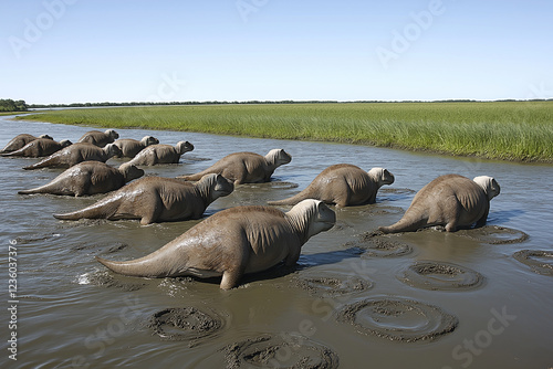 Prehistoric Procession: A Herd of Dinosaurs Wading Through a Tranquil River