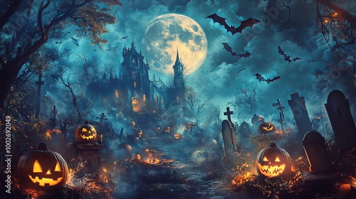 Premium Halloween illustration with a haunted background featuring pumpkins, a cemetery, and bats beneath a full moon. Ideal for banners, posters, greetings, and Halloween celebrations.