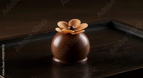 Premium handmade chocolate truffle with delicate sugar flower decoration in warm tones arranged on a wooden tray