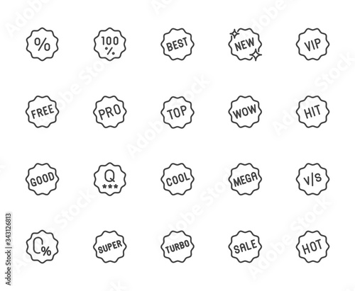Premium Icons Pack on Badges and Label for Promotions, Promo offer. Such Line Signs as Best, New, Vip, Free, Pro. Custom Vector Icons Set for Web and App in Outline Style. Editable Stroke.