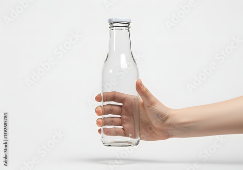 Premium Juice Packaging Concept—Empty Glass Bottle Mockup with lid Held Against a Bright Neutral Background
