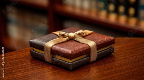 Premium leather-look gift box in chocolate brown with tan bow on a softly blurred executive desk backdrop