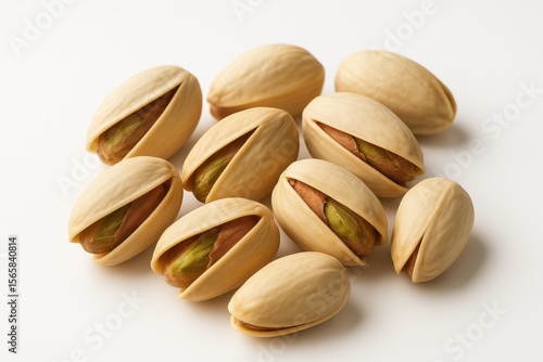 Premium pistachio nuts with natural shells arranged artistically on white background for healthy snack and nutrition marketing photography
