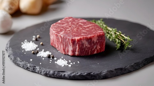 Premium raw beef cuts garnished with salt, pepper, and herbs.