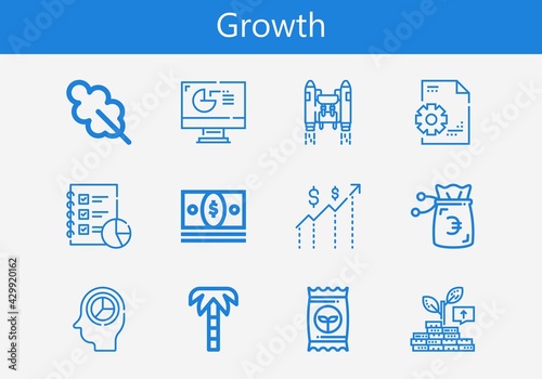 Premium set of growth line icons. Simple growth icon pack. Stroke vector illustration on a white background. Modern outline style icons collection of Oak leaf, Money, Palm tree