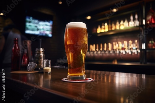 Preparation for watching the sport game.Cooled glass of beer with condensate on the wooden table. Blurred bar at the background Generative AI