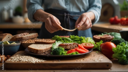 Preparing a Healthy Sandwich: Close-Up of Ingredients and Hands Assembling a Nutritious Meal