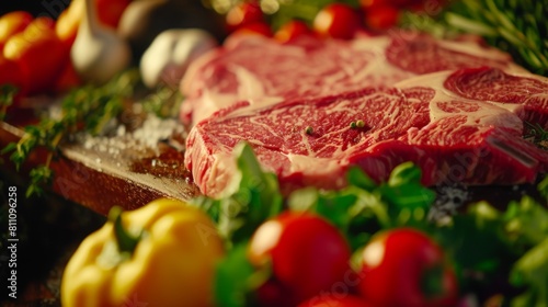 Preparing a meal as the raw meat and vegetables are arranged on the wooden table