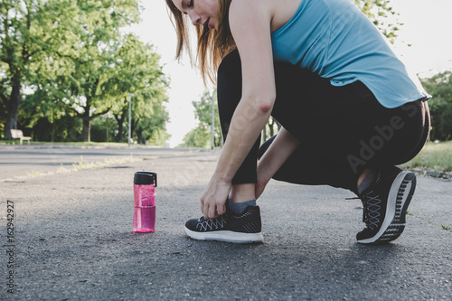 Preparing for running. Young woman tying her running shoes in the park