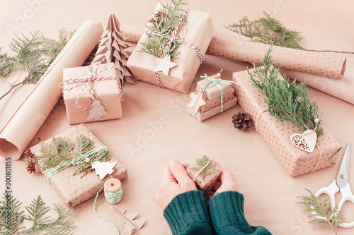 Preparing for the Christmas holidays. Gift wrapping. Woman hand with little gift box