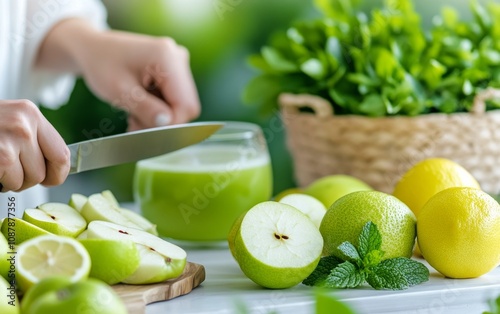 Preparing fresh green apples and mint for a healthy juice on a sunny kitchen countertop