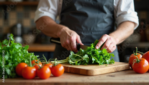 Preparing fresh herbs and tomatoes for a flavorful meal in a rustic kitchen setting
