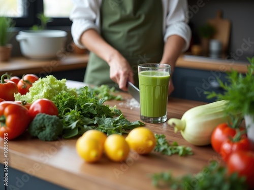 Preparing fresh vegetable ingredients on a kitchen table for healthy green smoothie in a cozy home kitchen