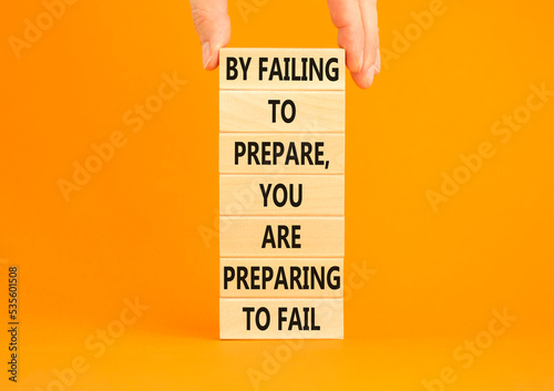Preparing symbol. Concept words By failing to prepare you are preparing to fail on wooden blocks on a beautiful orange background. Businessman hand. Business motivational and preparing concept.