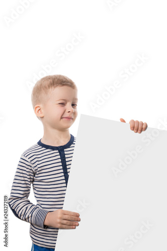preschool child on white background with poster in hand