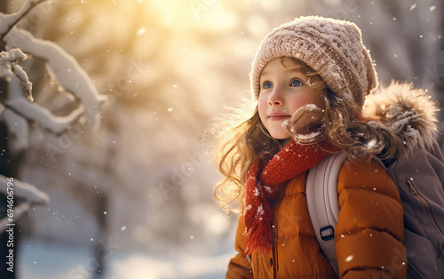 Preschool girl walking through the snowy forest on a bright morning. Cute kid in nature, forest in winter. Child, outdoor leisure.