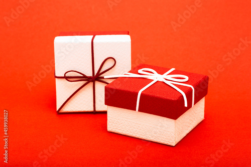 Present. Gift boxes packed with red bow. Birthday or Christmas gifts and greetings