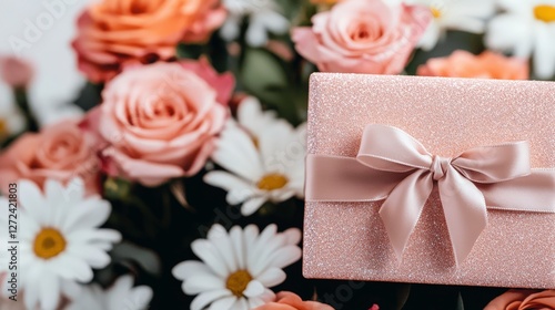 Present with a bow and flowers for a celebration on white background, gift for anniversary