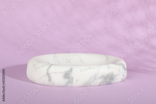 Presentation of product. White marble podium on violet background, space for text