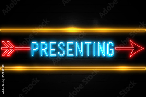 Presenting - fluorescent Neon Sign on brickwall Front view