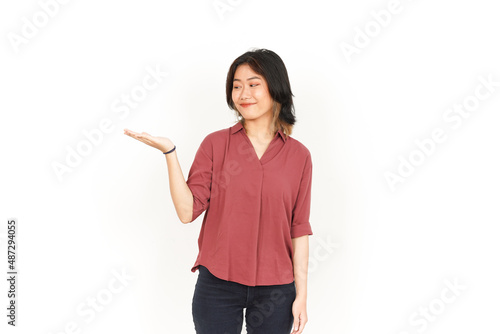 Presenting and Showing Product on Open Palm Of Beautiful Asian Woman Isolated On White Background