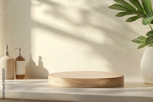 Presenting Product on Wooden Display with Minimalist Aesthetic and Natural Light