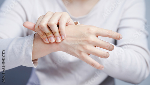 Pressing hand pain joint finger skin closeup health discomfort adult person white background human body care medical problem
