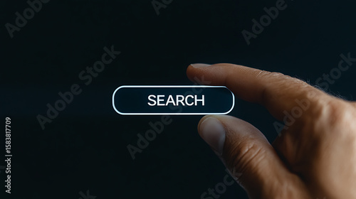 Pressing the search button: A finger hovers over a glowing 'Search' button, ready to initiate a query in digital space. Tech at your fingertips.