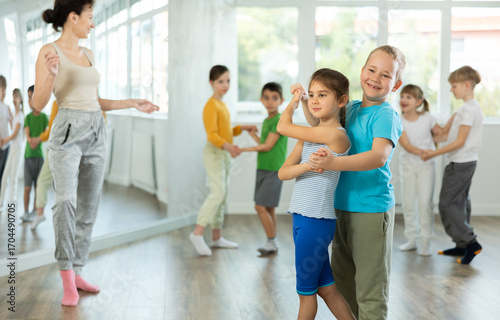 Preteen girls and boys learn to dance classical dances in a choreographic studio