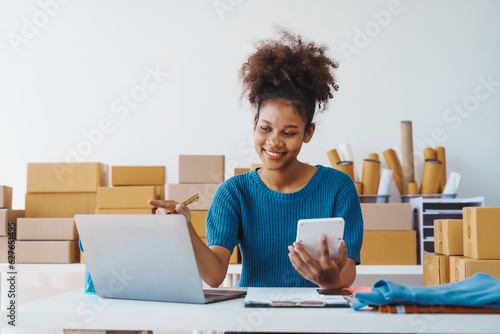 Pretty African American sme business woman working Custom Ecommerce Packaging leading supplier of custom packaging. create a personalised experience, fast production and competitive pricing