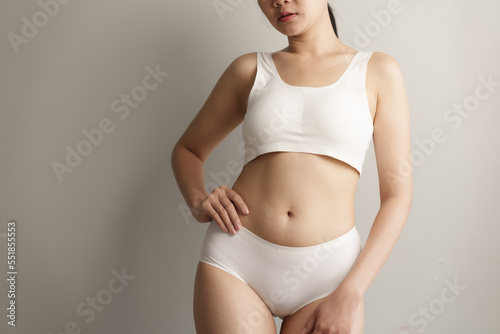 Pretty asian woman wears white lingerie poses against grey background with body care, bra, underwear concept.