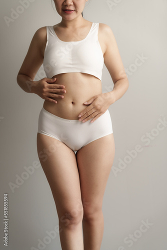Pretty asian woman wears white lingerie poses against grey background with body care, bra, underwear concept.