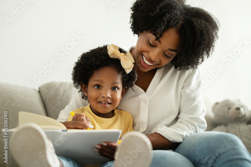 Pretty Black Mommy Reading Book With Her Cute Infant Daughter