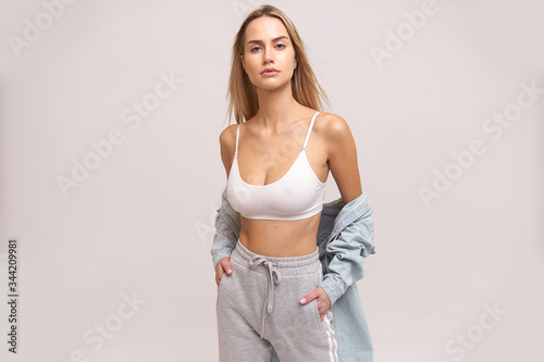 Pretty blonde woman in sport amazing style look posing for camera