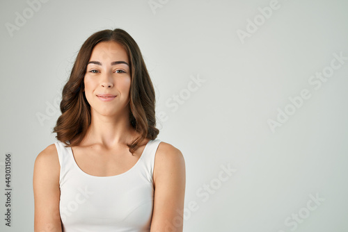 pretty brunette fashion hairstyle white tank top casual wear