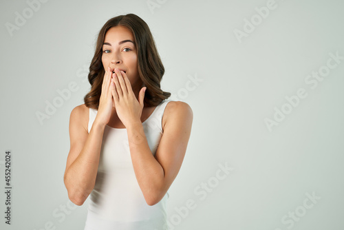 pretty brunette in white tank top holding hair fashion modern lifestyle