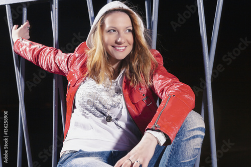 Pretty Caucasian Woman In red Leather Jacket and Blue Jeans Posing Outdoors at Night