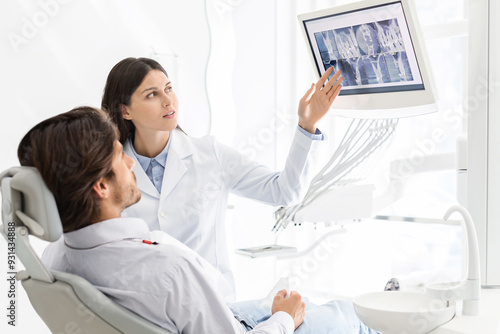 Pretty dentist showing his patient x-ray results, on modern lcd display, free space