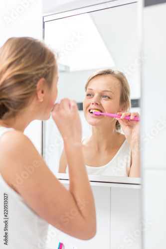 Pretty female brushing her teeth in front of mirror in the morning