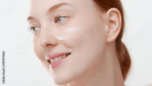 Pretty ginger young Caucasian woman with cream smears on her cheek smiles and looks aside on light grey background | Face cream commercial concept