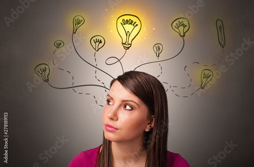 Pretty girl with draw bulbs above her head with different solutions concept