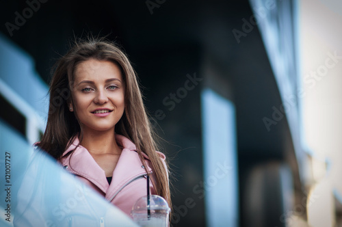 pretty girl with milk shake on the street.
