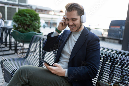 pretty man listening to music in headphones from a mobile phone with a smile on his face while sitting on a city bench in the park