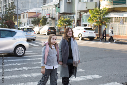Pretty mother and daughter hold each other's hand and cross the road at a crosswalk