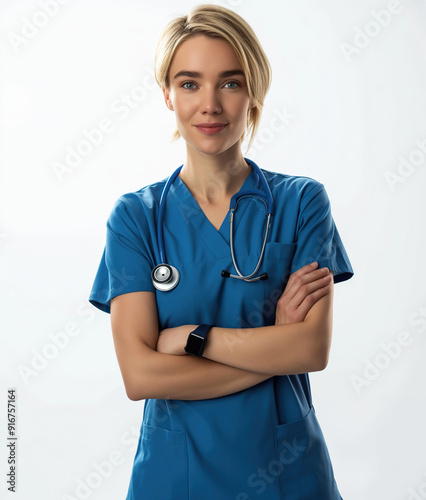 Pretty nurse with short blonde hair smiles while wearing scrubs in a bright hospital environment