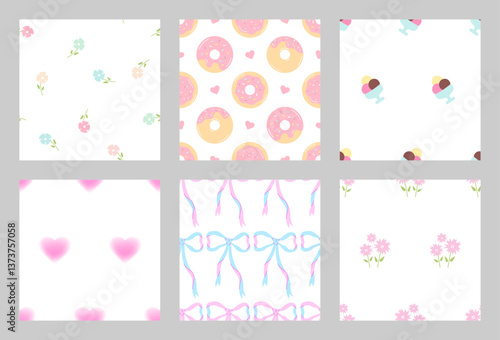 Pretty seamless patterns set. Cute backgrounds with bows, hearts, flowers, ice cream and donuts. Collection of backgrounds in coquette style. Children's banners, designs of covers, textiles, surfaces